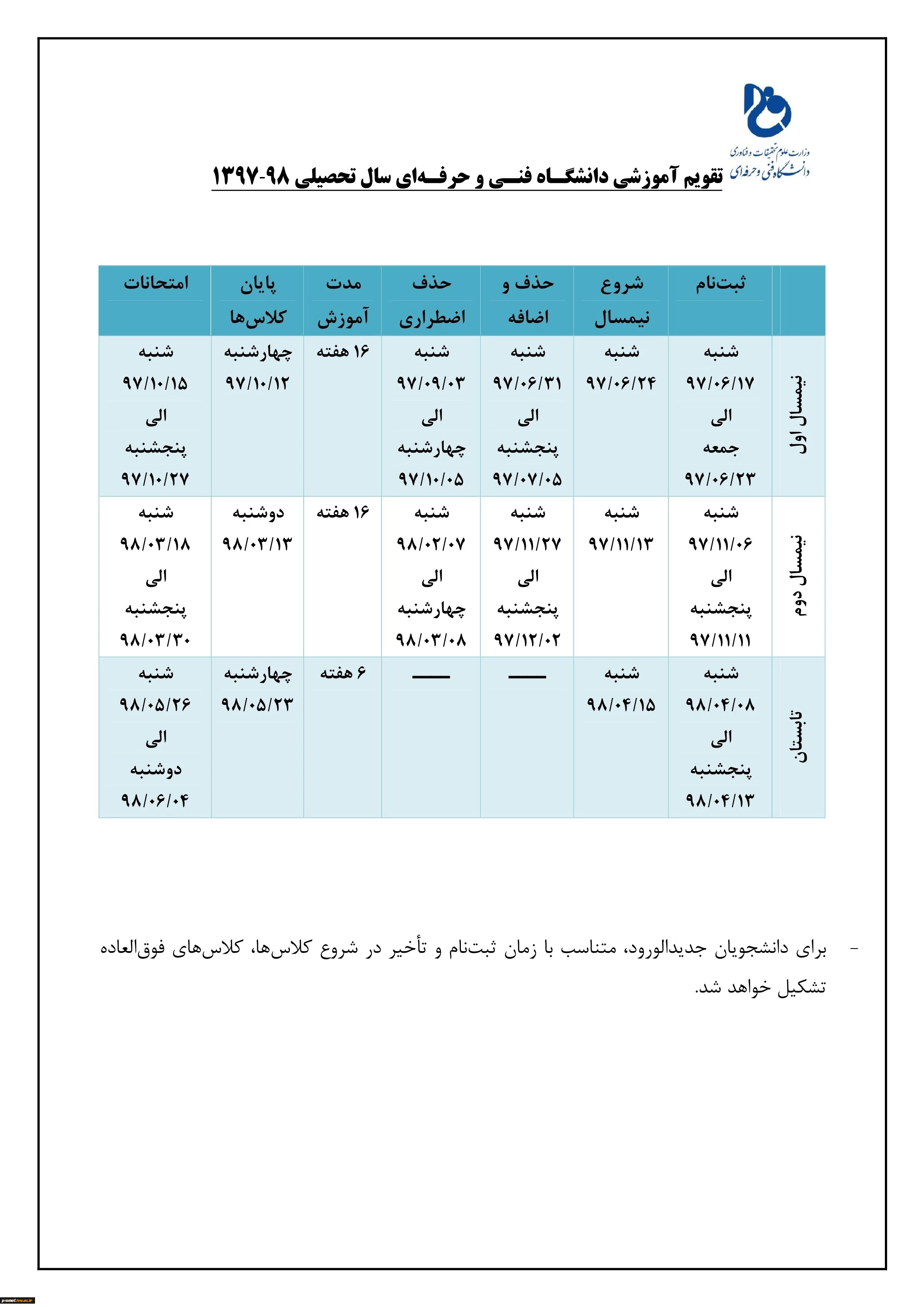 تقویم آموزشی دانشگاه فنی و حرفه ای سال تحصیلی 98-1397