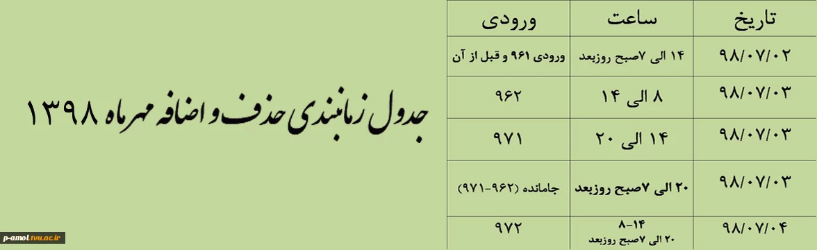 جدول زمانبندی حذف و اضافه مهر 98 2