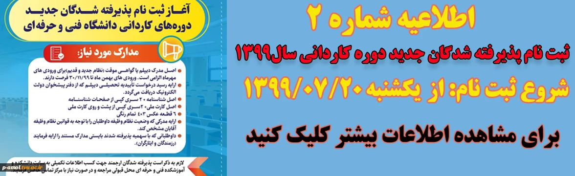 امتیاز دهید : اطلاعیه شماره 2 درخصوص ثبت نام پذیرفته شدگان دوره کاردانی سال 1399 2 شنبه 19 مهر 1399 ساعت 11:19